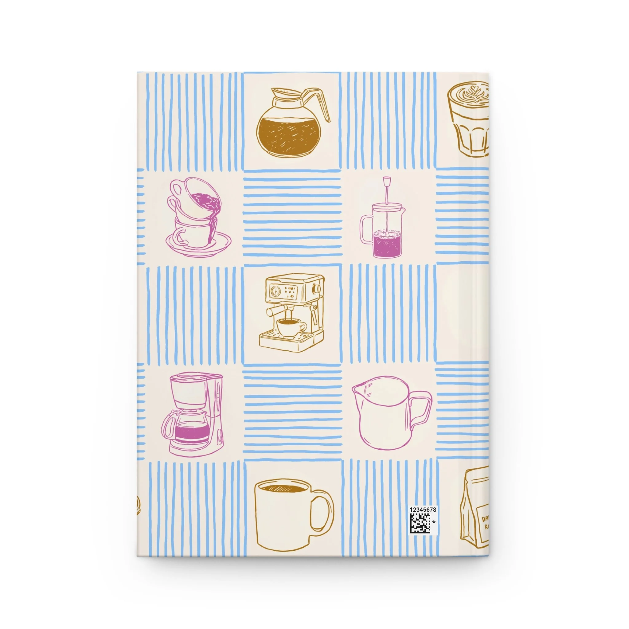 This hardcover journal carries a cheery, coffee-shop energy—lined pages waiting for plans, sketches, lists, or slow mornings. The matte laminate cover features a hand-drawn checkerboard of coffee icons (mugs, espresso machines, French press, pour-over carafes) and the playful phrase “Powered by Caffeine.” It sits comfortably on a kitchen table, tucked beside a steaming cup, or inside a tote for café sessions. The sewn casewrap binding opens flat for smooth writing. Pages are lined and perforated so you can tear out a note or recipe without damaging the book. Bright, saturated printing keeps the artwork lively through daily use, while the full wraparound print makes the design feel continuous and personal.